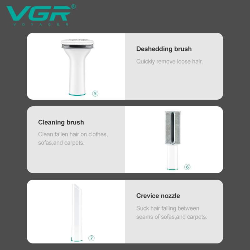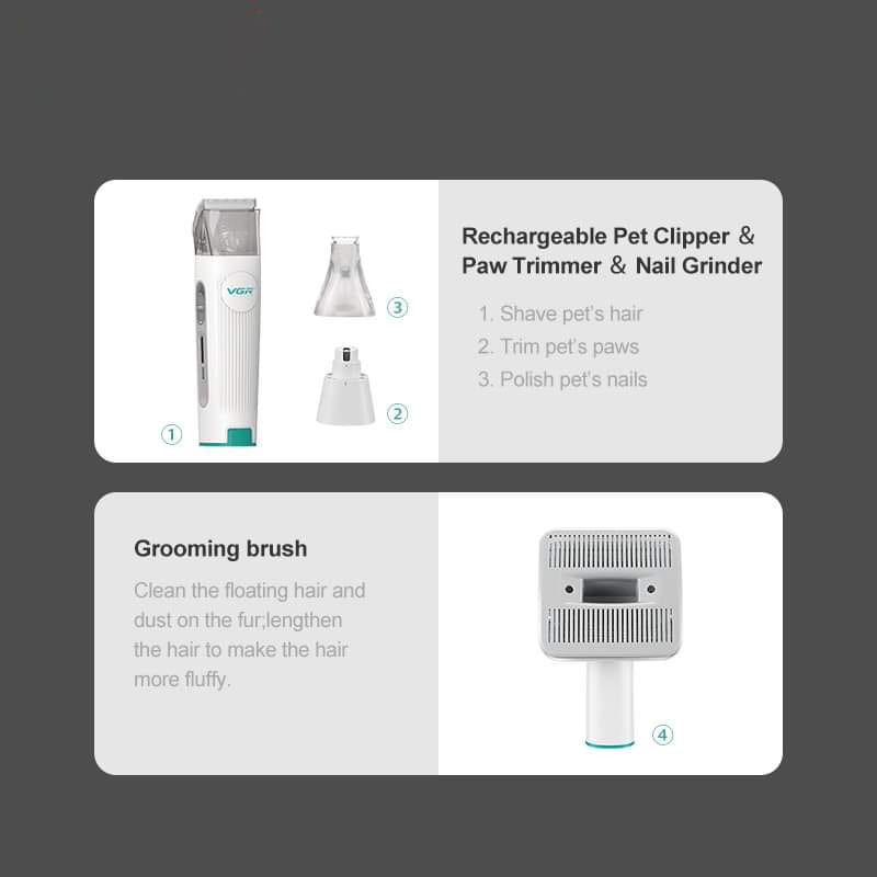 1- وکیوم نظافتی، که حالت یک جارو برقی کوچک را دارد و این امکان را به شما میدهد هنگام نظافت و اصلاح حیوان خانگی محیط خانه تمیزی خود را حفظ بنماید و تمامی سری های همراه محصول از طریق لوله خرطومی به دستگاه وکیوم اتصال دارند.